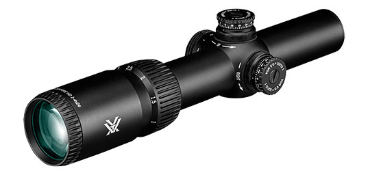 Magnification1-4xObjective Lens Diameter24 mmFocal PlaneSecond Focal PlaneReticleIlluminated Dead-Hold® 2A BDC (MOA)Eye Relief3.8"Field of View109.5' - 26.7' @ 100 yds.Turret StyleCappedTube Size30mmAdjustment Graduation1/2 MOATravel Per Rotation30 MOAMax Elevation Adjustment130 MOAMax Windage Adjustment130 MOAParallax Setting100 yds.Length9.5"Weight15.3 oz.