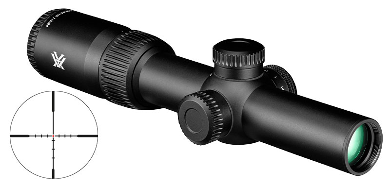 Magnification1-4xObjective Lens Diameter24 mmFocal PlaneSecond Focal PlaneReticleIlluminated Dead-Hold® 2A BDC (MOA)Eye Relief3.8"Field of View109.5' - 26.7' @ 100 yds.Turret StyleCappedTube Size30mmAdjustment Graduation1/2 MOATravel Per Rotation30 MOAMax Elevation Adjustment130 MOAMax Windage Adjustment130 MOAParallax Setting100 yds.Length9.5"Weight15.3 oz.